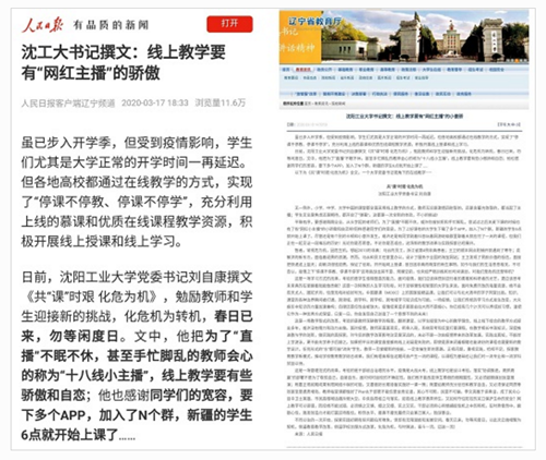 3月17日,校党委书记刘自康撰文《共“课”时艰 化危为机》受到人民日报客户端、辽宁省教育厅网站等媒体广泛报道。文中指出,此次因疫情开启的全面线上教学,对学生来讲是一场学习方式的改革,对教师来讲是一场教学型式的改革,对学校来讲是一场管理范式的改革。全校上下要以此次线上教学为契机,倒逼教育教学改革,倒逼学校治理方式改革,化危为机,与时俱进,向一流大学迈进。