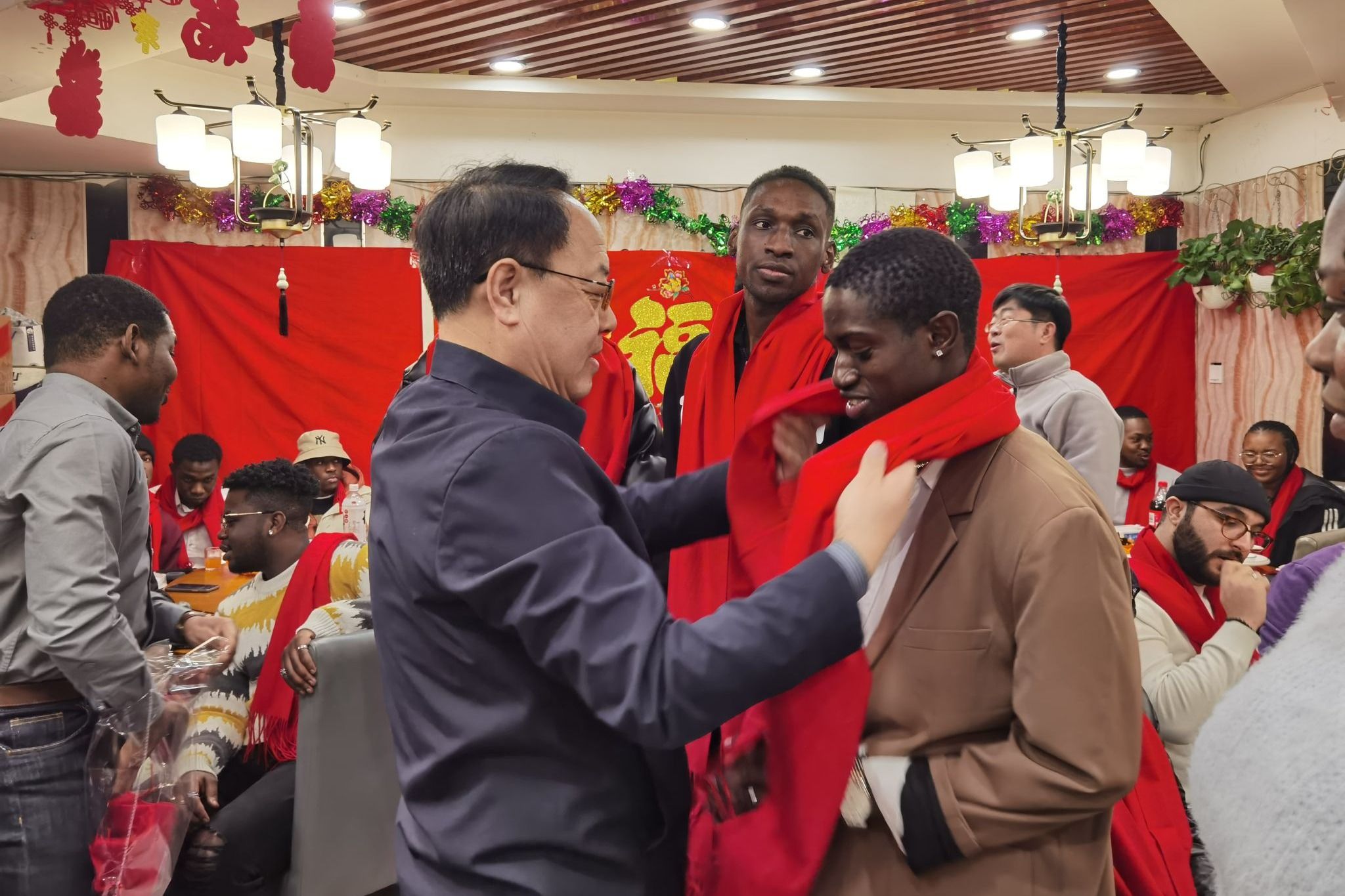 国际教育学院领导班子和教师代表组织52名在沈留学生包饺子、话年俗、表演节目,宣传中国文化,欢度农历新年。贾玉明为留学生送去学校关爱和新春祝福,为他们佩戴红色围巾。张珂为留学生送上对联。校领导详细了解留学生学习、生活情况,叮嘱大家要常与家人、老师联系,希望他们能在中国新年的欢快氛围下,感受中华优秀传统文化,能够在学校度过一个幸福、平安的龙年春节。留学生们表示一定不辜负学校期望,好好利用假期,努力学习,不断充实自我,立志成长成才。